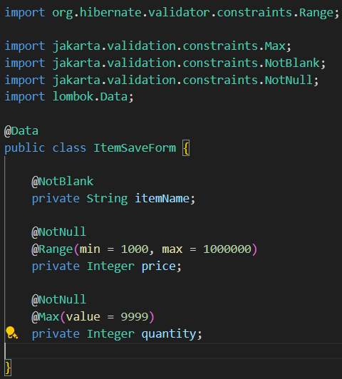 - 매핑되는 객체의 앞에 @Validated 어노테이션을 추가해줍니다.